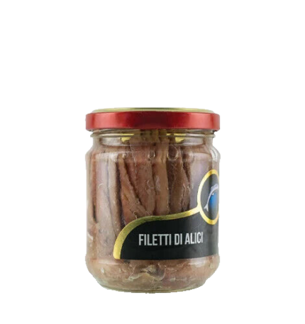 Alici (58%), (Engraulis Encrasicolus), olio di semi di girasole, prezzemolo, peperoncino, sale.